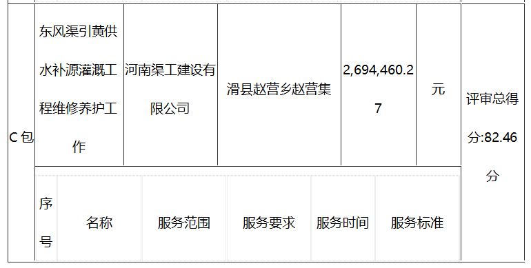 C包:东风渠引黄供水补源灌溉工程维修养护工作,包括对干渠、倒虹吸、涵洞、水闸、排涝沟、沉砂池、农渠、堤防等水利工程进行维修养护。