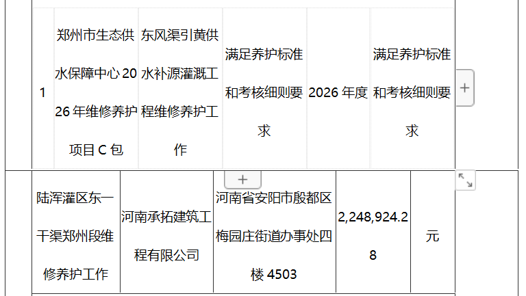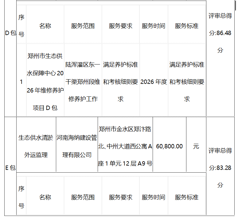 D包:陆浑灌区东一干渠郑州段维修养护工作包括对干渠、支渠、渡槽、隧洞、涵洞、填方坝、水闸、泵站、天坡水库、水情教育基地等水利工程进行维修养护。
