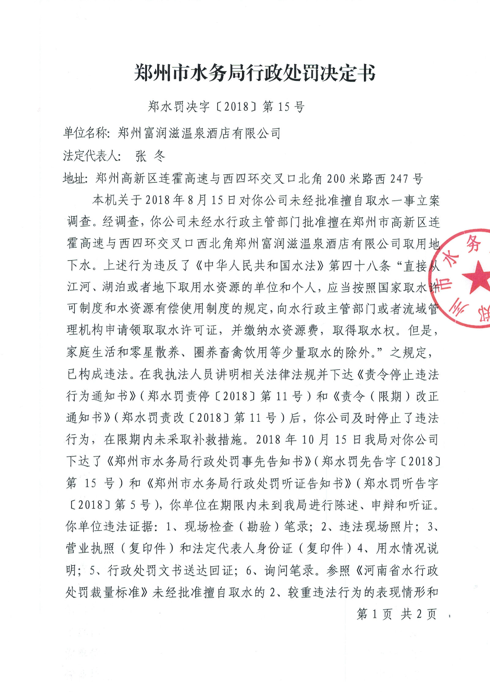 郑州富润滋温泉酒店有限公司违法取水案